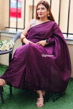 Khadi cotton saree with all over zari strips - Effortlessly stylish and comfortable, this saree is perfect for your day-to-day wear, office hours, and special celebrations. Khadi cotton fabric is a traditional handspun and handwoven textile made from 100% natural cotton fibers. It is renowned for its breathability, softness, and versatility, making it ideal for clothing in warm and varied climates.