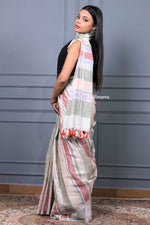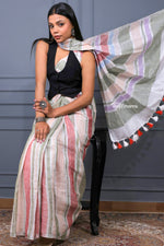 This elegant hand-woven linen saree features straight stripes in soothing shades of grey, light pink, white and red, woven evenly across the body for a clean and contemporary look. The harmonious color palette creates a perfect balance of softness and vibrancy, making it versatile for both casual and semi-formal wear. A subtle silver zari running along the border adds a touch of refined shimmer, enhancing the saree’s understated charm. Lightweight, breathable, and gracefully structured, this saree is a timeless blend of modern design and traditional handloom craftsmanship.